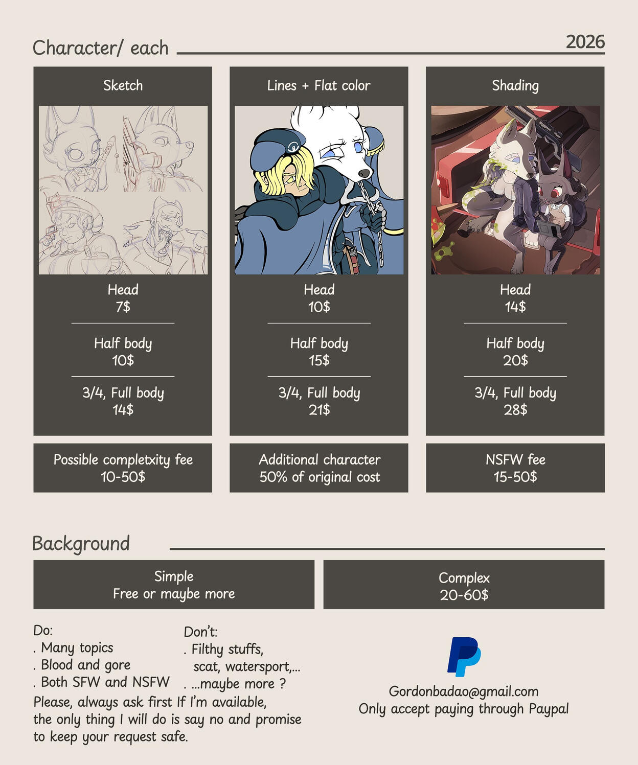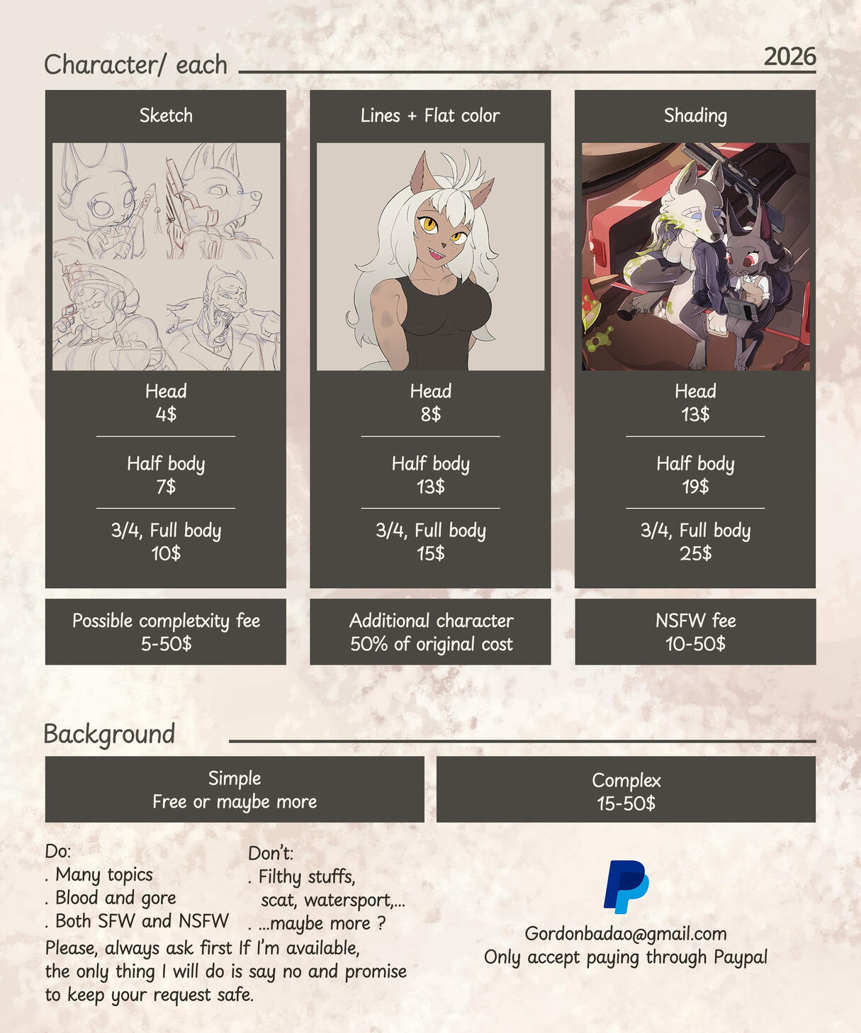- I got other works as well so it sometime can take long, about a week or a month for a piece, you can contact me through Discord or Mail to know how I'm working on it.